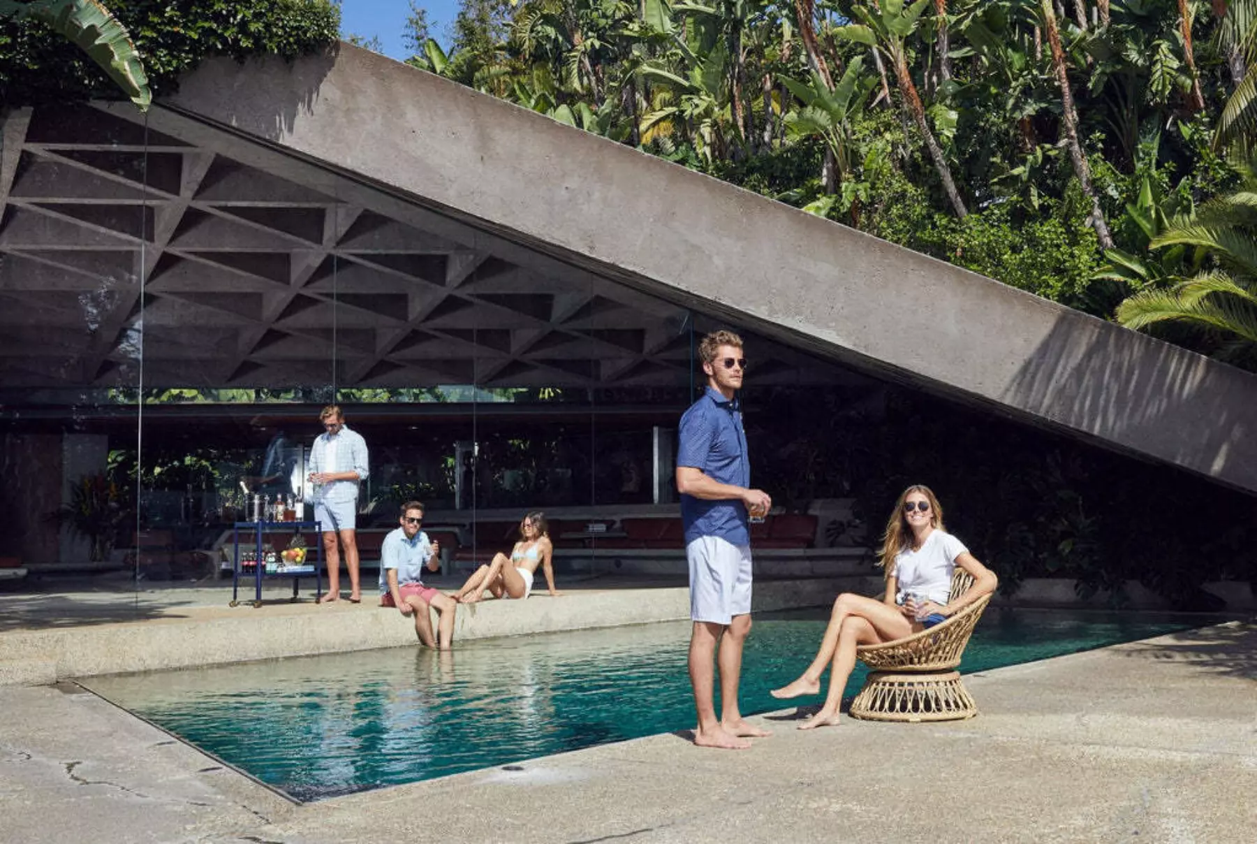We'd like to introduce you to the Goldstein House — architectural beauty from the genius of John Lautner and backdrop for the johnnie-O spring catalog! Superbly seated on a Los Angeles hillside, the Goldstein Residence boasts spectacular views of the city, a tennis court, and even its own nightclub, aptly named "Club James' after its eccentric owner. Because why not?