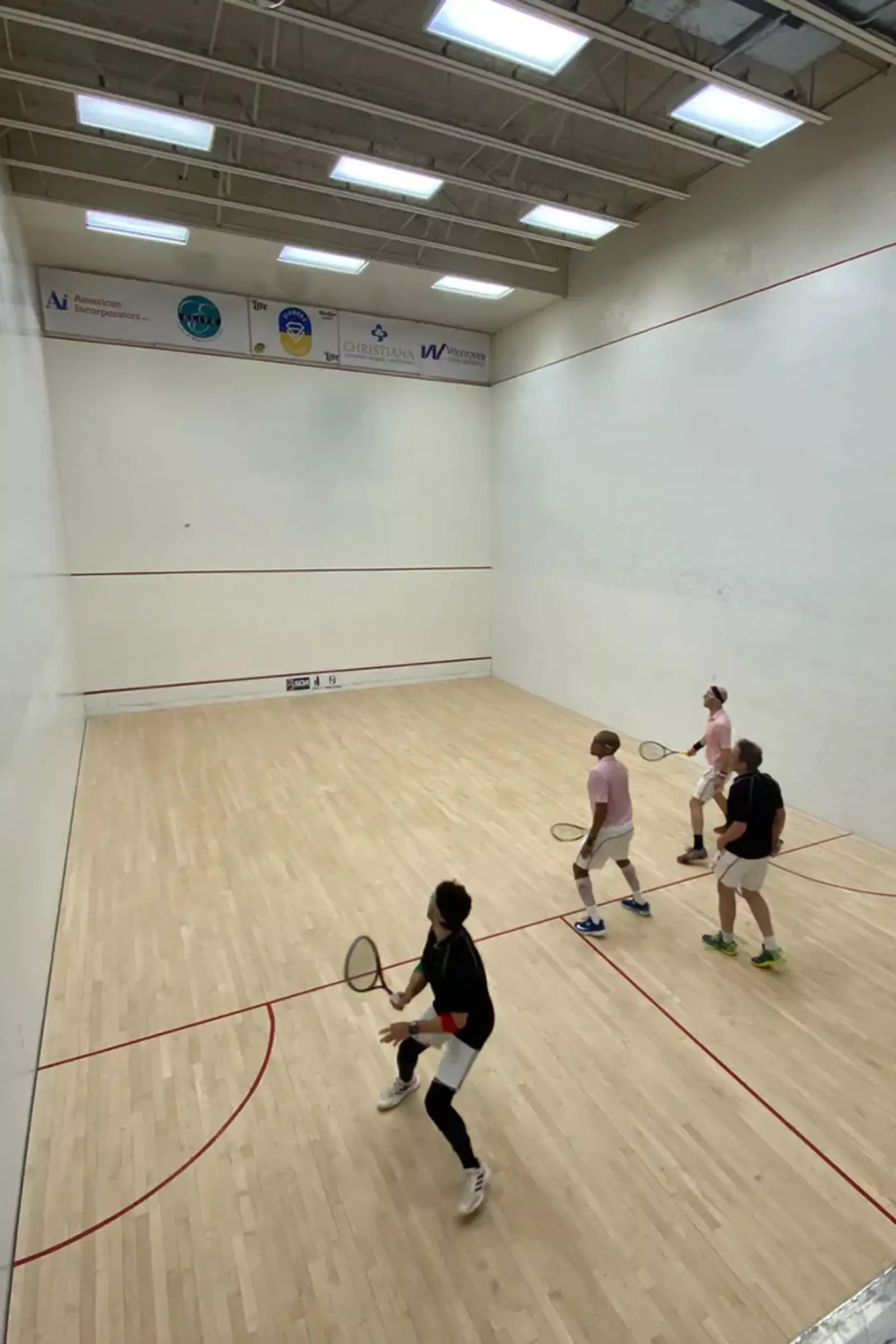 Clinton: We do a mix of singles and doubles. Singles squash for overall fitness and then we practice together and do practice matches. We train together about 3 times a week and then we do our own fitness and gym work on the other days.