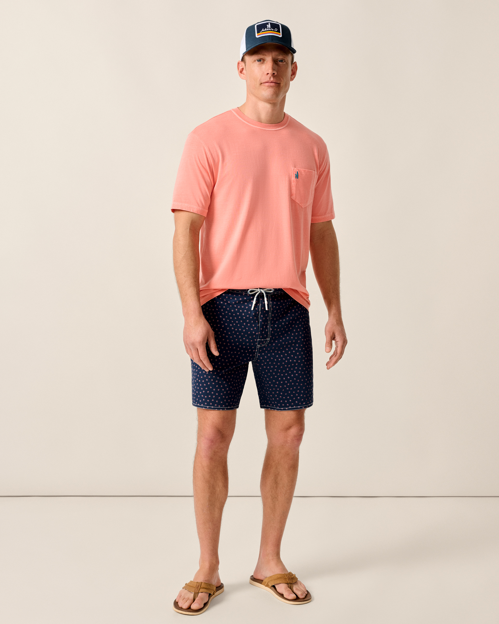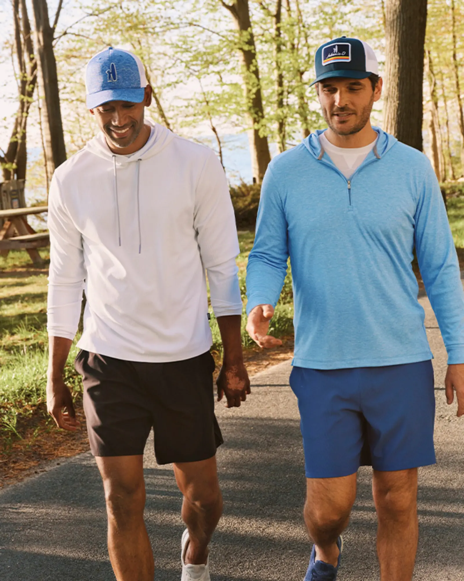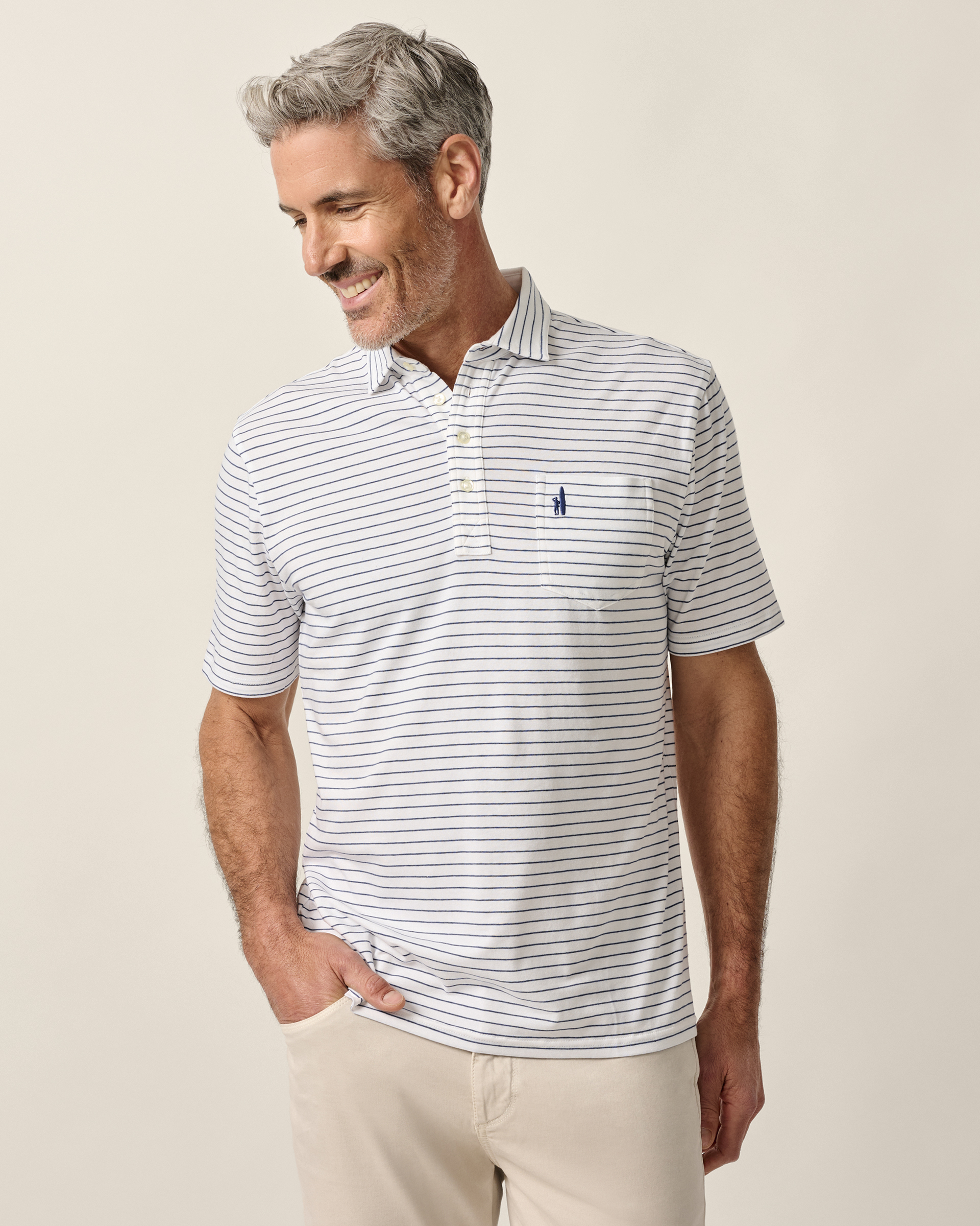 Two men dressed in cotton Johnnie-o polos while standing on a dock