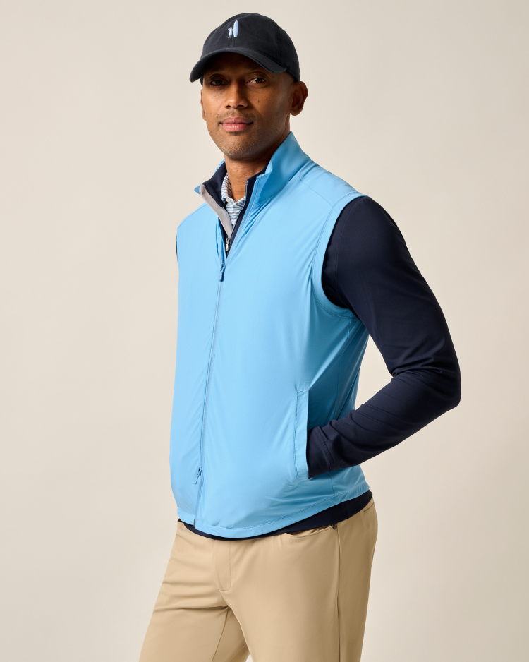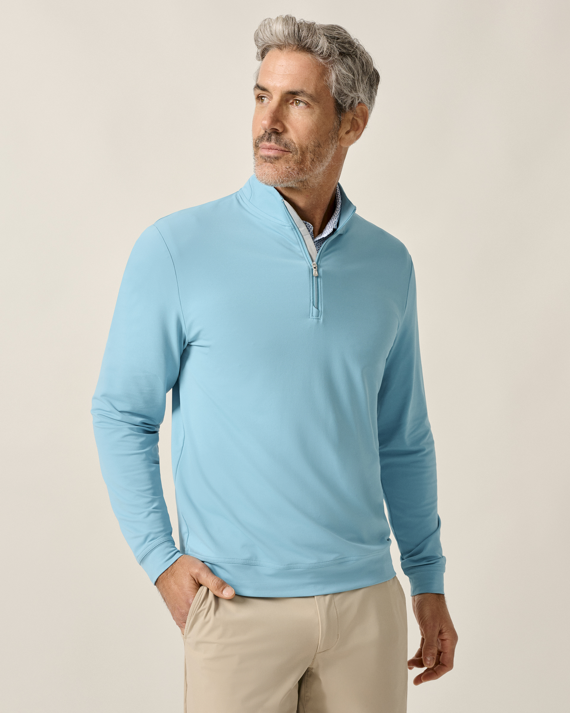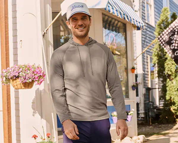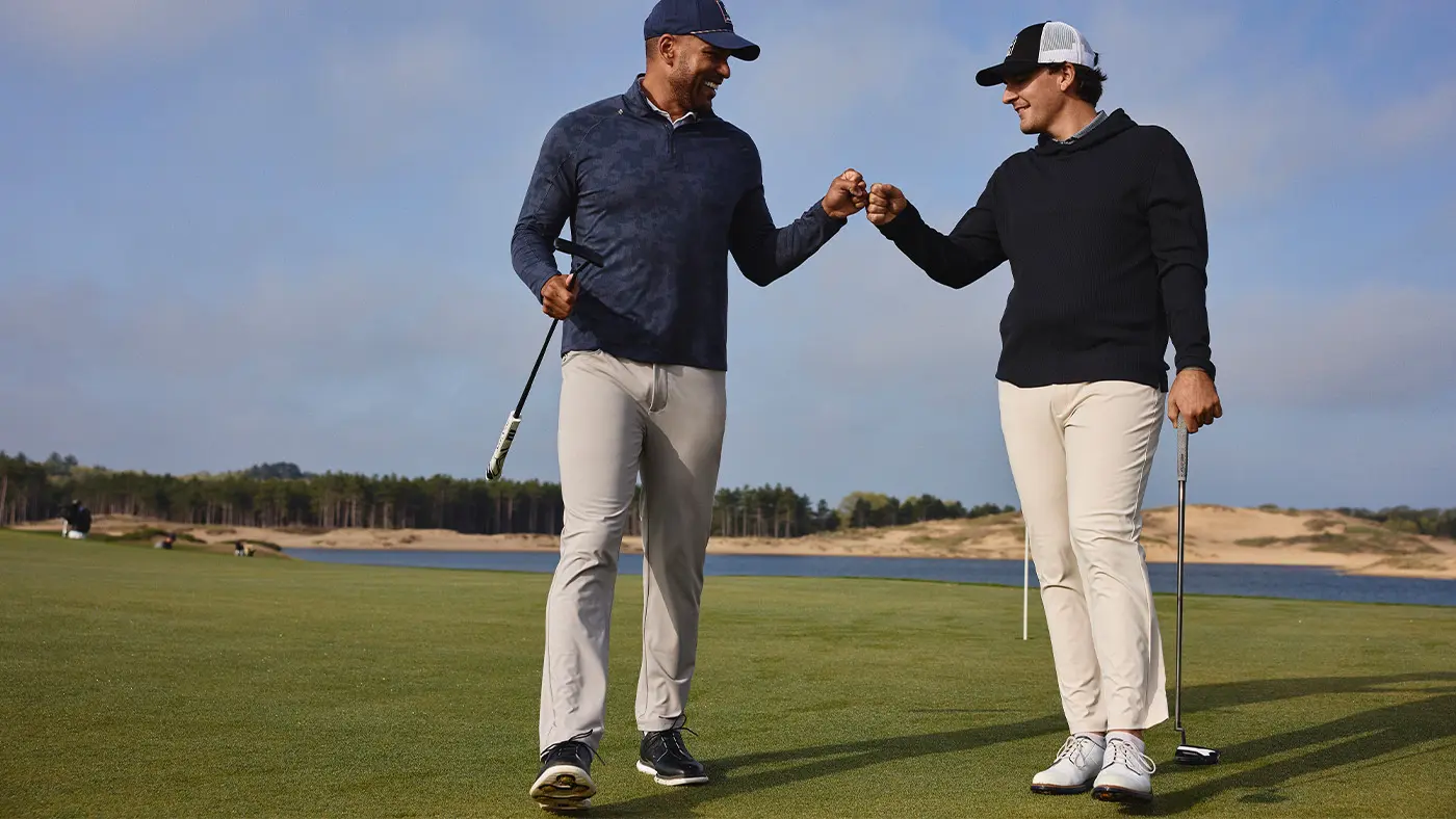 Two men dressed in cotton Johnnie-o polos while standing on a dock